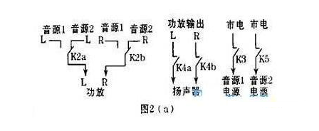 2.音源選擇:按開/選擇鍵,IC2第13腳先輸出低電平,使紅色LED6點(diǎn)亮作電源接通顯示,并使V4導(dǎo)通,K1得電吸合,將功放電源接通。3秒后第13腳恢復(fù)為高電平,第14腳轉(zhuǎn)為低電平,使綠色LED7點(diǎn)亮作音源1接通顯示,V5導(dǎo)通,使K2、K3得電吸合,接通圖2(a)中的音源1信號(hào)和電源。因VD2作用,V4仍導(dǎo)通,使K1吸合接通功放電源。同時(shí)經(jīng)VD8也使K4得電吸合接通揚(yáng)聲器。