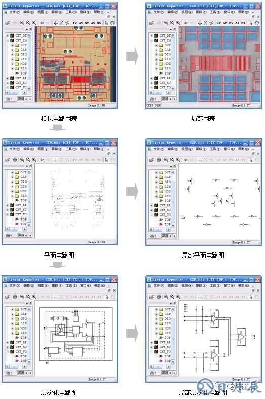 輔助類工具軟件當(dāng)然,除了這三大EDA廠商的IC設(shè)計(jì)工具外,Altera 、Xilinx、KeilSoftware這三家公司的軟件quartus ii、ISE、KEIL開發(fā)環(huán)境等,都是對(duì)于IC設(shè)計(jì)流程中比不可少的工具。它們分別是用于FPGA、單片機(jī)ARM芯片的開發(fā)。這類軟件在芯片的CP測試和芯片應(yīng)用方案開發(fā)上會(huì)有用到。版圖提取工具,NetEditorLite、ChipAnalyzer,這兩個(gè)工具主要是針對(duì)芯片反向設(shè)計(jì)而言的。算法設(shè)計(jì)工具,MATLAB,此工具應(yīng)用范圍很廣,但對(duì)于芯片設(shè)計(jì)來說,它較為適用于算法原型開發(fā),例如,通信算法。PCB版圖工具,Altium Designer,Orcad,Allegro。其中,目前Orcad,Allegro是屬于cadence電路系統(tǒng)設(shè)計(jì)套件內(nèi)的主要軟件,而Altium Designer是最常用的軟件,它的前身是Protel。Labview與數(shù)字源表,這一對(duì)軟硬件主要用于芯片電氣參數(shù)的半自動(dòng)化測試,特別是模擬芯片。其目的是芯片設(shè)計(jì)公司用于分析芯片樣品參數(shù)用。對(duì)于這些工具的該如何使用,我會(huì)在下面的文章中進(jìn)行說明。ps:沒有具體說明軟件使用環(huán)境的,一般是在windows環(huán)境下使用。先從反向設(shè)計(jì)說起。下面是我整理的芯片反向設(shè)計(jì)的流程圖。