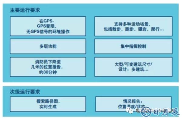 火災(zāi)搜救任務(wù)必須嚴(yán)格按照救援程序執(zhí)行,同時(shí)必須適應(yīng)完全不確定的現(xiàn)實(shí)生活場(chǎng)景??刹渴鸬木_定位系統(tǒng)必須在最大限度內(nèi)適應(yīng)現(xiàn)有的流程和設(shè)備。這就要求無需任何固定或臨時(shí)基礎(chǔ)設(shè)施即可操作,因?yàn)榧本热藛T通常已背負(fù)重要設(shè)備(重量和成本)。任何系統(tǒng)開發(fā)都應(yīng)遵從實(shí)現(xiàn)小型嵌入式設(shè)備的早期階段目標(biāo)且單位急救人員成本與智能手機(jī)相似。有必要指出,目前智能手機(jī)的定位性能嚴(yán)重不足,因此面臨著挑戰(zhàn)。圖1概述了理想系統(tǒng)最相關(guān)的主要和次要運(yùn)行要求。