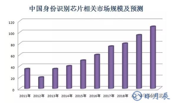 據(jù)公開數(shù)據(jù)整理及預(yù)測,2012-2017年間,我國的身份識別芯片市場保持高速增長,預(yù)計2020年我國身份識別芯片市場將達到百億級別。