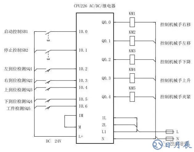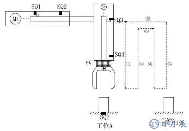 如上圖所示,M1為控制機(jī)械手左右移動的電動機(jī),M2為控制機(jī)械手上下升降的電動機(jī),YV線圈用來控制機(jī)械手夾緊防松,SQ1為左到位檢測開關(guān),SQ2為右到位檢測開關(guān),SQ3為上到位檢測開關(guān),SQ4為下到位檢測開關(guān) ,SQ5為工件檢測開關(guān)。