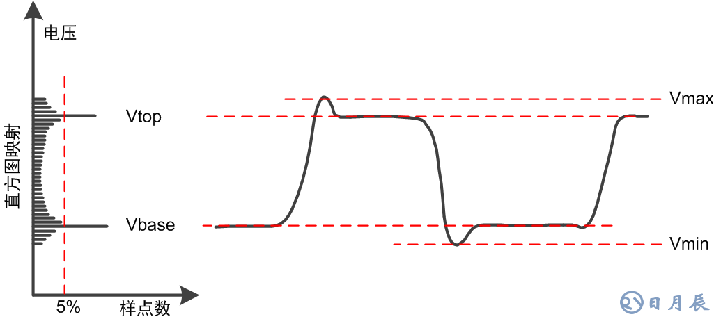 與電壓相關(guān)的測量,相對比較簡單,最大值(Vmax)與最小值(Vmin)可通過遍歷所有樣本點求出。頂部值(Vtop)和底部值(Vbase)的求解,需要先對所有樣本點進行直方圖映射,然后求出現(xiàn)概率最大的電壓值。