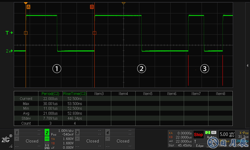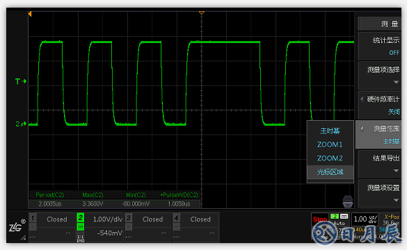 使用測量時,經(jīng)常會遇到的一個問題是,捕獲下來的波形比較多,但是我只想測量分析波形中的一部分。在ZDS3000/4000系列示波器中,我們通過硬件加速,提供了一種自定義測量范圍的方法,只需要簡單的兩個步驟即可完成。