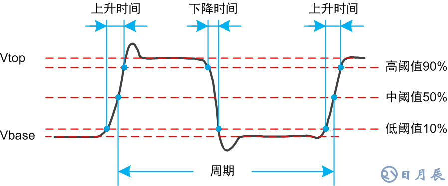 與時間相關(guān)的測量項,需要使用頂部值(Vtop)和底部值(Vbase),然后再通過Vtop與Vbase計算出高中低三根閾值線的位置,最后求閾值線與波形的交點,可得到時間相關(guān)的測量結(jié)果,如圖3所示。高中低三根閾值線的位置可調(diào)節(jié),默認值為90%、50%、10%。