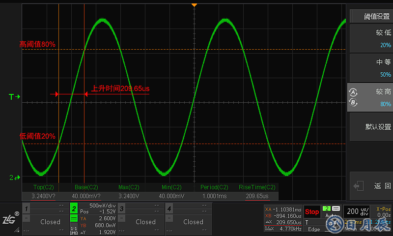 小結(jié):有一些特殊的波形(如正弦波)會出現(xiàn)Vtop和Vbase求解失?。ǜ怕噬儆?%),此時會使用Vmax與Vmin作為新的頂部值與底部值,并且會在Vtop和Vbase的值后面,追加?號顯示來表示異常,如圖4所示。