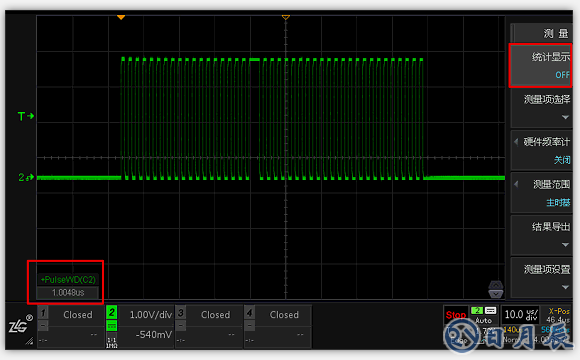 小結(jié):測量統(tǒng)計功能默認是關(guān)閉,可在菜單中打開。統(tǒng)計關(guān)閉時,僅顯示當前值(Current),統(tǒng)計打開時,顯示6種統(tǒng)計結(jié)果。圖6中使用了正脈寬統(tǒng)計功能,可求得最大的脈寬為3.0028us,脈沖個數(shù)為42個。