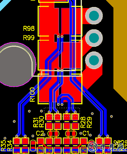 為了能夠準(zhǔn)確的采樣電流,應(yīng)將運(yùn)放芯片在PCB上的位置盡量靠近采樣電阻,同時(shí)又要使運(yùn)放芯片不能遠(yuǎn)離MCU,運(yùn)放的地和MCU的地應(yīng)該盡量靠攏。如圖3所示,采樣電阻(R98、R99、R100)兩端走差分線到運(yùn)放的同相和反相端口,差分線應(yīng)等距并且盡量短,以避免其他的干擾產(chǎn)生。壓縮機(jī)涉及到高壓和低壓部分,在布局電流地的時(shí)候,應(yīng)使大電流地和小電流地能很好的單點(diǎn)隔離。