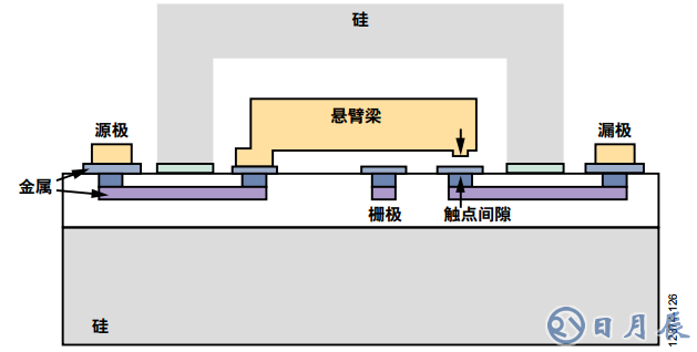 下圖是該開(kāi)關(guān)的橫截面示意圖。它是一種三端子配置的靜電 驅(qū)動(dòng)懸臂梁式開(kāi)關(guān)。其在功能上類(lèi)似于場(chǎng)效應(yīng)晶體管 (FET),端子可用作源極、柵極和漏極。