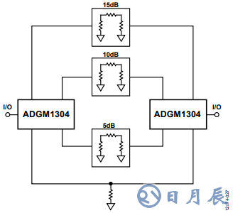 ADGM1304 MEMS開(kāi)關(guān)具有很低且平坦的插入損耗、超寬 RF帶寬和高可靠性,適合用作可切換的RF衰減器。ADGM1304作為SP4T開(kāi)關(guān),還能帶來(lái)額外的靈活性。圖1顯示了一個(gè)衰減器網(wǎng)絡(luò)配置示例,其使用兩個(gè)ADGM1304 開(kāi)關(guān)和三個(gè)不同的衰減器。開(kāi)關(guān)的第四通道用于圖1中的非衰減路由。