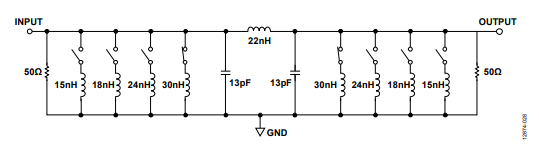 為了開(kāi)啟集總元件(電容、電感),需要ADGM1304 MEMS 開(kāi)關(guān),其具有很低且平坦的插入損耗、超寬RF帶寬、低寄 生效應(yīng)、低電容和高線性度,因此非常適合可重復(fù)配置濾波器應(yīng)用。