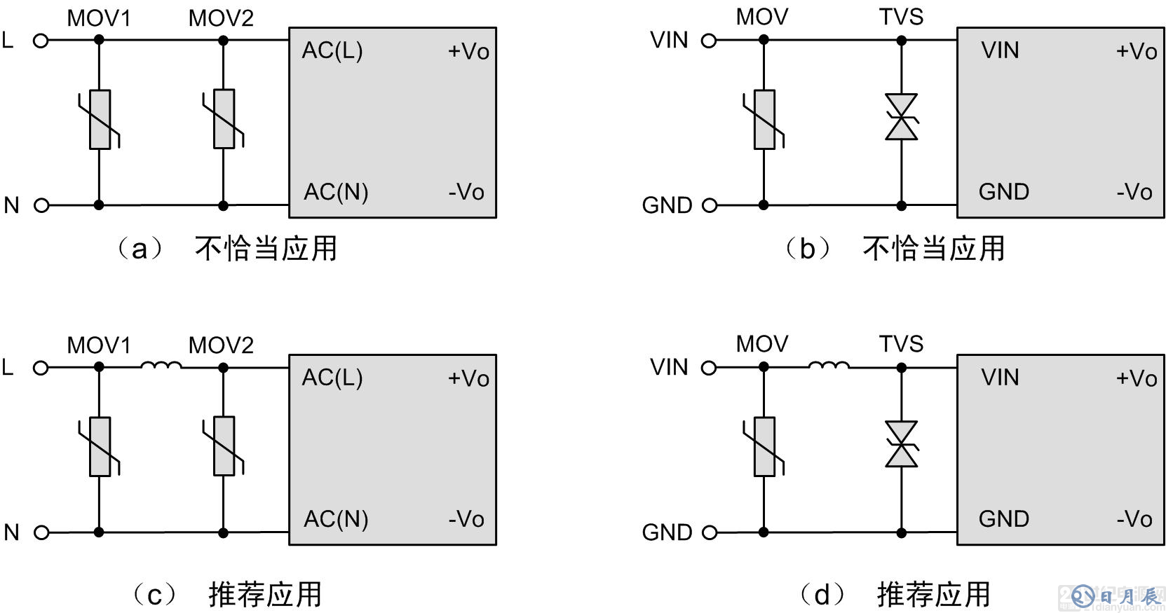 由于電源模塊體積小,在EMC要求比較高的場合,需要增加額外的浪涌防護電路,以提升系統(tǒng)EMC性能,提高產品的可靠性。如圖2所示,為提高輸入級的浪涌防護能力,在外圍增加了壓敏電阻和TVS管。但圖中的電路(a)、(b)原目的是想實現(xiàn)兩級防護,但可能適得其反。如果(a)中MOV2的壓敏電壓和通流能力比MOV1低,在強干擾場合,MOV2可能無法承受浪涌沖擊而提前損壞,導致整個系統(tǒng)癱瘓。同樣的,電路(b),由于TVS響應速度比MOV快,往往是MOV未起作用,而TVS過早損壞。所以正確的接法一般是如圖(c)、(d)所示,在兩個MOV或是MOV和TVS之間接一個電感。