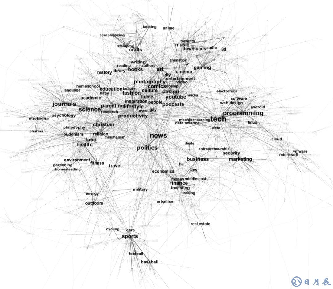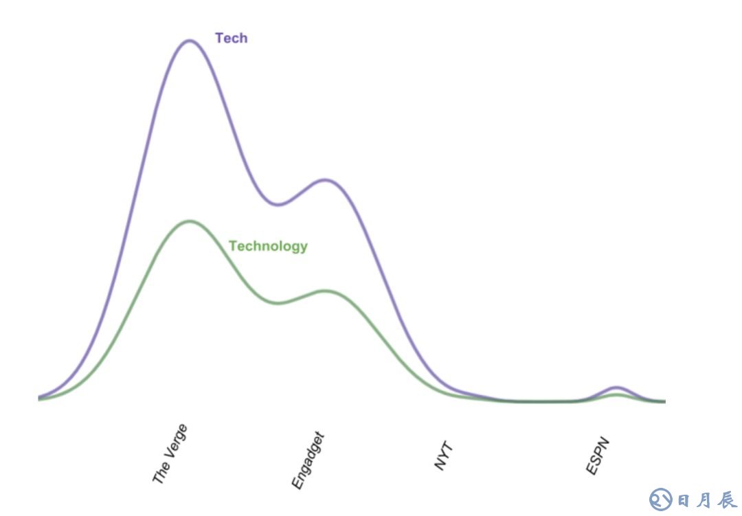 上面的模式也確認(rèn)了人們以大致相同的方式使用“tech”和“technology”。“technology”的線要細(xì)一點(diǎn),因?yàn)槿藗冚^少使用這一術(shù)語。不過這兩個(gè)主題是重復(fù)的。同時(shí),“Apple”看起來是“tech”的子主題:它連接了更少的信息源,而且它的連接同時(shí)也和“tech”相關(guān)。