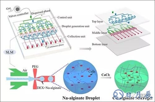 在該工作中,劉海濤等建立了一種基于微流控技術(shù)的雙水相高通量液滴生成新體系,并成功用于負(fù)載具有胰島素分泌功能的胰島細(xì)胞。實(shí)驗(yàn)中,科研人員設(shè)計(jì)了一種集成化多層微流控芯片,并將聚乙二醇(PEG)-葡聚糖(DEX)雙水相體系引入到功能化芯片體系中。通過(guò)芯片中單層膜閥(SLM)的機(jī)械作用力和對(duì)雙水相體系界面能的增大作用,加速其相分離,進(jìn)一步可控獲得高通量的“水包水”(Water-in-Water)雙水相液滴。這種陣列微液滴用于負(fù)載細(xì)胞(如胰島細(xì)胞)時(shí),可以維持胰島細(xì)胞的高存活率和胰島素分泌功能,充分顯示了其作為微凝膠活細(xì)胞3D載體的可行性。該研究建立的雙水相微載體制備微流控新體系具有高通量、生物相容性好、液滴載體大小一致和精確可控等優(yōu)勢(shì),在蛋白/多肽類(lèi)藥物負(fù)載、細(xì)胞治療、水相功能化微粒合成和組織工程等方面具有重要應(yīng)用前景。