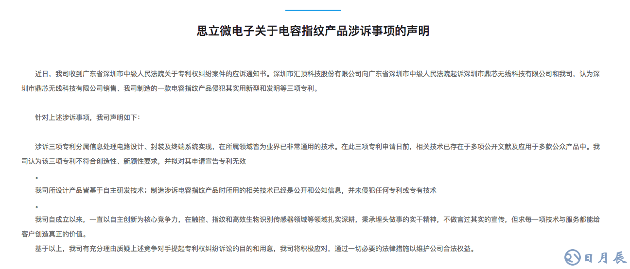 思立微電子關(guān)于電容指紋產(chǎn)品涉訴事項(xiàng)的聲明如下: