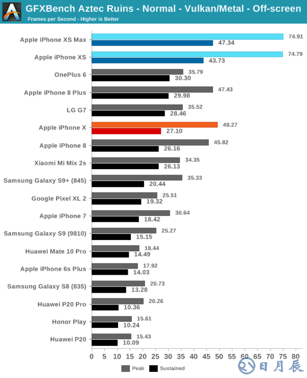 在曼哈頓3.1中, iPhone XS的性能比iPhone X高出75%。這里的改進(jìn)不僅要?dú)w功于增加的核心,還有顯存壓縮技術(shù)降低RAM功耗的功勞。