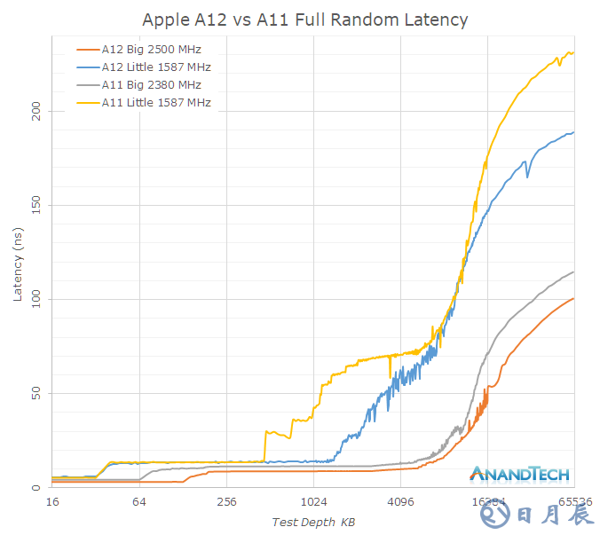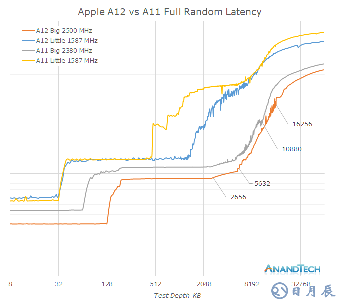 正如之前所提到的,蘋果在A12的緩存結(jié)構(gòu)和內(nèi)存子系統(tǒng)上投入了大量的工作?;氐骄€性延遲圖上,我們看到以下針對(duì)大核和小核的完全隨機(jī)延遲的行為: