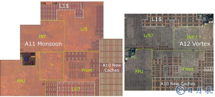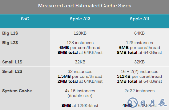 從圖上可以看出,A12的共享緩存被劃分成了4個(gè)區(qū)塊,而此前自A7至A11這5代處理器均為2區(qū)塊設(shè)計(jì)。緩存區(qū)塊的加倍很有可能代表著緩存性能有了很大提升,這個(gè)在稍后的測(cè)試中再見(jiàn)分曉。