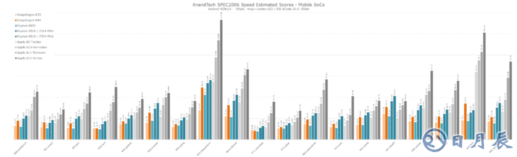 其中增幅最小的是456.hmmer和464.h264ref這兩項(xiàng)測(cè)試,這也是SPECint2006套件中成為瓶頸最多的測(cè)試。由于A12架構(gòu)方面似乎沒(méi)有真正的重大變化,小幅增長(zhǎng)主要?dú)w功于更高的頻率以及緩存結(jié)構(gòu)的改進(jìn)。