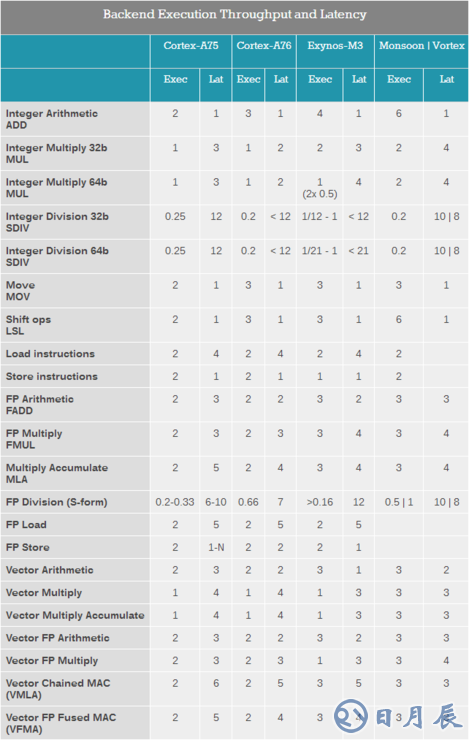 Vortex核心與Monsoon核心看起來(lái)非常相似,整數(shù)除法和浮點(diǎn)除法的執(zhí)行延遲都減少了2個(gè)周期,浮點(diǎn)吞吐量則是翻了一倍。