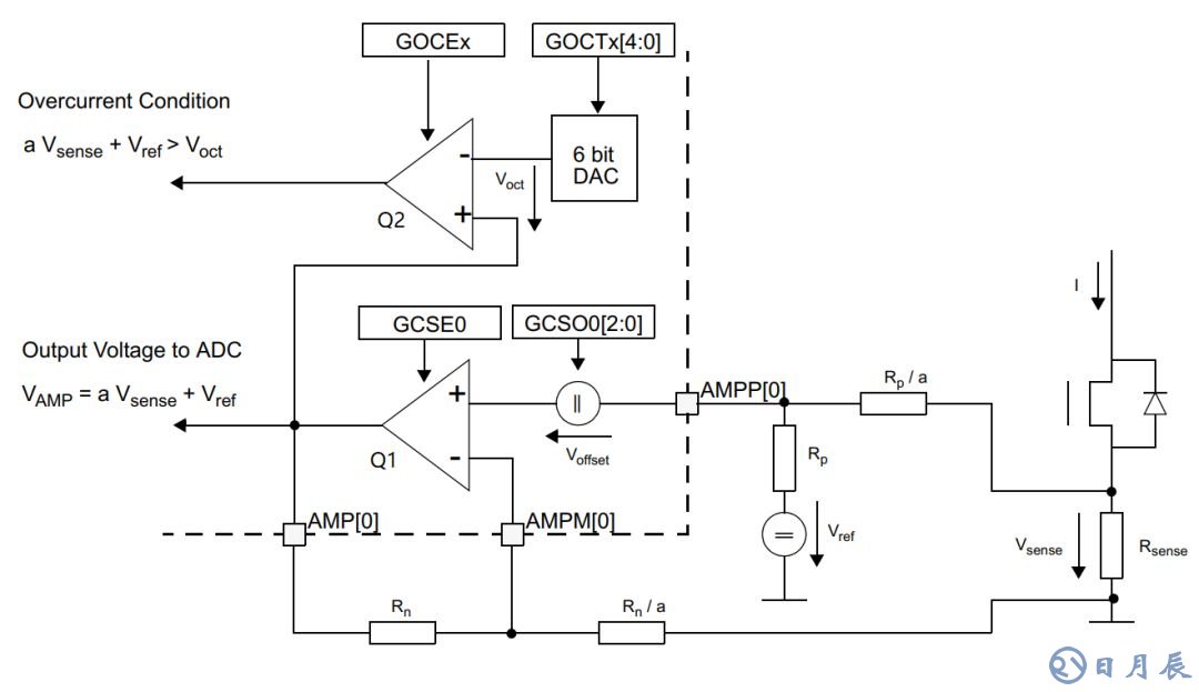 Q2是一個比較器,比較器的負輸入端是過流閾值(GOCT),當通過放大后的電壓超過閾值,可直接觸發(fā)中斷,這部分功能通過寄存器設置,上電初始化之后是純硬件操作,反應極快。