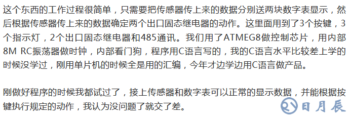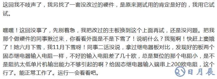 這么個小東西程序不超過2K怎么這么多問題?我不至于這么爛吧?這么個小程序都寫不好?還得試找出問題!反復試了幾十次發(fā)現(xiàn)規(guī)律了,只要是自動狀態(tài)的1號狀態(tài)再和數(shù)字表一通訊就復位,是不是485通訊沒加隔離的問題?動手加隔離(這里要說一下我們的軟硬件是兩個人負責的,我做軟件,另一個同事專做硬件),我的同事剛才加了按鍵的隔離這回又加485的隔離,為了增加隔離電源又在原裝置的基礎上改了電源。改完了裝上測試,還復位!天??!我同事都不用好眼色看我了!