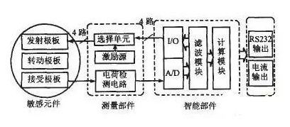 由敏感元件、測(cè)量電路、智能部件與接口部件構(gòu)成,敏感元件的結(jié)構(gòu)所示如圖1,測(cè)量部件由選擇單元、激勵(lì)源和電荷檢測(cè)單元組成;智能部件由I/O單元、A/D單元、濾波單元、角度計(jì)算單元等組成;接口部件由電流輸出單元、RS232通訊單元等組成。