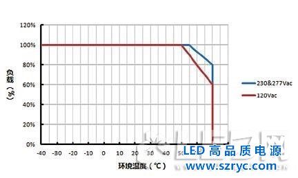 藍(lán)色曲線則表示LED驅(qū)動(dòng)器在輸入230Vac或 277Vac情況下,其負(fù)載隨環(huán)境溫度變化的功率降額曲線,其原理類同。