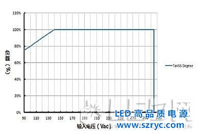 如圖2所示,藍(lán)色曲線表示LED驅(qū)動(dòng)器在環(huán)境溫度55℃時(shí),其輸出功率隨輸入電壓變化的降額曲線。當(dāng)輸入電壓為140Vac時(shí),驅(qū)動(dòng)器的負(fù)載允許100%滿載,隨著輸入電壓下調(diào);若輸出功率不變,輸入電流將上升,導(dǎo)致輸入端損耗加大,效率降低,器件溫度上升,個(gè)別溫度點(diǎn)將可能超標(biāo),甚至可能導(dǎo)致器件失效。