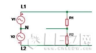 如圖3所示,V1表示第一相電壓,V2表示第二相電壓,R1及R2分別表示正常安裝到線路中的LED驅(qū)動(dòng)器。當(dāng)線路上零線(N)如圖斷開時(shí),兩個(gè)支路上的驅(qū)動(dòng)器R1,R2相當(dāng)于串聯(lián)后接到380Vac電壓上。因?yàn)檩斎雰?nèi)阻差異,當(dāng)其中一個(gè)驅(qū)動(dòng)器充電到啟動(dòng)時(shí),內(nèi)阻變小,電壓可能大部分加到另外一個(gè)驅(qū)動(dòng)器上,導(dǎo)致其過壓損壞失效。因此建議同一配電支路上,開關(guān)或斷路器要一起斷,不能只斷開零線。配電保險(xiǎn)絲不要放在零線上,線路上要避免零線接觸不良。