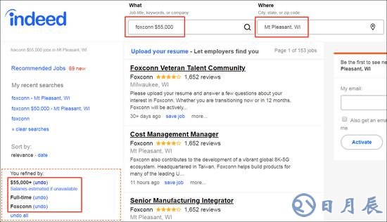 觀察者網(wǎng)在美國求職網(wǎng)站“indeed.com”上查詢到,富士康工廠目前共放出182個全職職位,估算收入不低于55000美元的職位共153個,其中大部分為管理人員。
