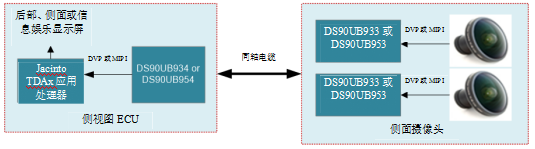 從車輛后方來看,成像器的視頻數(shù)據(jù)輸入到TI的DS90UB933并行接口串行器或具有攝像串行接口(CSI)-2的DS90UB953串行器。然后將這些數(shù)據(jù)通過平板顯示器(FPD)-LinkIII同軸電纜串行到DS90UB934或DS90UB954解串器,然后輸出到應用處理器進行視頻處理(例如JacintoTM?TDAx處理器),然后顯示在后視鏡顯示屏上。如果顯示屏遠離Jacinto應用處理器,則需要顯示接口串行器和解串器將數(shù)據(jù)通過同軸電纜再次路由。您可以分別使用DS90UB921和DS90UB922紅綠藍(RGB)格式串行器和解串器,或者,如果您要應用更高分辨率的顯示屏,則可以使用DS90UB947和DS90UB948開路低壓差分信號顯示接口(LDI)器件。