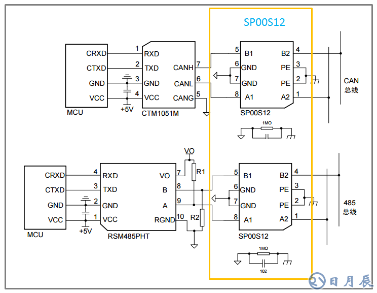 上圖所示的接口電路雖然能夠提供有效的防護(hù),但是需要引入較多的電子器件,這也就意味著接口電路將占用更多的PCB空間,若器件參數(shù)選擇不合適易造成EMC問題。有沒有更好的辦法呢?致遠(yuǎn)電子已經(jīng)為小伙伴們?cè)O(shè)計(jì)了專業(yè)的信號(hào)浪涌抑制器SP00S12,該模塊直接將總線浪涌等級(jí)提高到IEC61000-4-5±4KV。