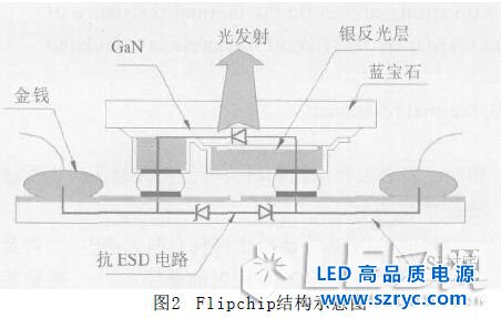 因此這種p 型接觸結(jié)構(gòu)制約了LED 芯片的工作功率。同時這種結(jié)構(gòu)pn結(jié)的熱量通過藍寶石襯底導出去,導熱路徑較長,由于藍寶石的熱導系數(shù)較金屬低(為3 5 W / m ·K ),因此,這種結(jié)構(gòu)的L E D芯片熱阻會較大。此外,這種結(jié)構(gòu)的p電極和引線也會擋住部分光線進入器件封裝,所以,這種正裝LED芯片的器件功率、出光效率和熱性能均不可能是最優(yōu)的。為了克服正裝芯片的這些不足,L u m i l e d s Lighting公司發(fā)明了倒裝芯片(Flipchip)結(jié)構(gòu),如圖2 所示。在這種結(jié)構(gòu)中,光從藍寶石襯底取出,不必從電流擴散層取出。由于不從電流擴散層取光,這樣不透光的電流擴散層可以加厚,增加Flipchip的電流密度。同時這種結(jié)構(gòu)還可以將pn結(jié)的熱量直接通過金屬凸點導給熱導系數(shù)高的硅襯底(為1 4 5 W / m ·K ),散熱效果更優(yōu);而且在p n結(jié)與p 電極之間增加了一個反光層,又消除了電極和引線的擋光,因此這種結(jié)構(gòu)具有電、光、熱等方面最優(yōu)的特性。本文僅對藍寶石GaN倒裝芯片的襯底粘接材料對大功率LED器件熱特性的影響進行分析。