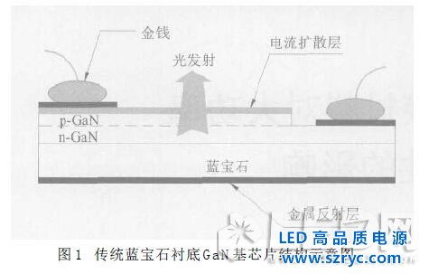 目前GaN 基外延襯底材料有兩大類[1]:一類是以日本“日亞化學”為代表的藍寶石;一類是美國CREE公司為代表的SiC 襯底。傳統(tǒng)的藍寶石襯底GaN 芯片結(jié)構(gòu)如圖1 所示,電極剛好位于芯片的出光面。在這種結(jié)構(gòu)中,小部分p-GaN 層和“發(fā)光”層被刻蝕,以便與下面的n-GaN 層形成電接觸。光從最上面的p-GaN 層取出。p-GaN 層有限的電導率要求在p-GaN層表面再沉淀一層電流擴散的金屬層。這個電流擴散層由N i和A u組成,會吸收部分光,從而降低芯片的出光效率。為了減少發(fā)射光的吸收,電流擴展層的厚度應減少到幾百納米。厚度的減少反過來又限制了電流擴散層在p-GaN 層表面均勻和可靠地擴散大電流的能力。