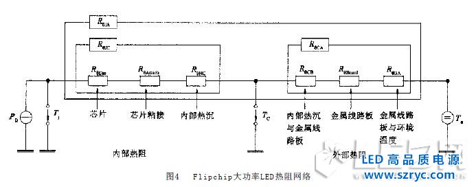 大功率LED芯片電極上焊接的數(shù)個BUMP(金球)與Si襯底上對應的BUMP通過共晶焊接在一起,Si襯底通過粘接材料與器件內(nèi)部熱沉粘接在一起。為了有較好的取光效果,熱沉上制作有一個聚光杯,芯片安放在杯的中央,熱沉選用高導熱系數(shù)的金屬材料如銅或鋁。穩(wěn)態(tài)時LED熱阻的等效連接如圖4所示。