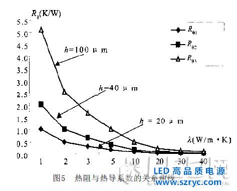 下面我們以臺灣國聯(lián)光電公司的Flipchip為例進行分析。國聯(lián)的芯片submount(襯底)是邊長為55mil 的正方形,即A 為1.96 ×10-6m2。我們來分析熱導系數(shù)為λ對粘貼材料熱阻的影響。