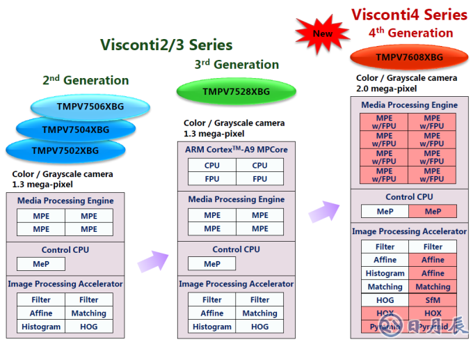 • Visconti™系列圖像識(shí)別處理器處理搜集來(lái)自車(chē)載攝像頭的輸入圖像,并檢測(cè)人類(lèi)、頭部和手臂以及車(chē)輛和其他物體的運(yùn)動(dòng);