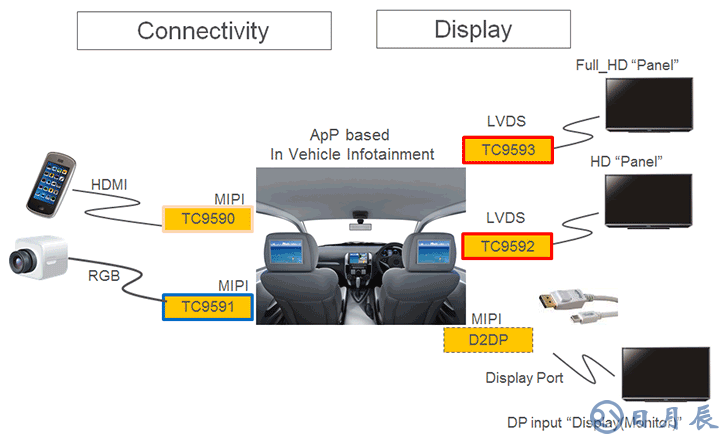 Toshiba的車(chē)用雙畫(huà)面視頻處理器配置了集成幀內(nèi)存,因此可以同時(shí)顯示兩個(gè)獨(dú)立的畫(huà)面。此外,芯片上的內(nèi)存允許導(dǎo)航系統(tǒng)的圖形資料覆蓋視頻信號(hào)。Toshiba的視頻處理器,支持各種類(lèi)比和數(shù)位視頻格式,并允許根據(jù)液晶面板的分率來(lái)優(yōu)化調(diào)整圖片。其輸出端階段的配置有適用于不同品牌液晶面板的時(shí)序控制芯片。T-CON適用于多個(gè)液晶面板制造商生產(chǎn)的LCD面板。