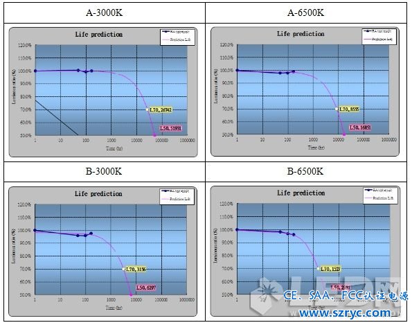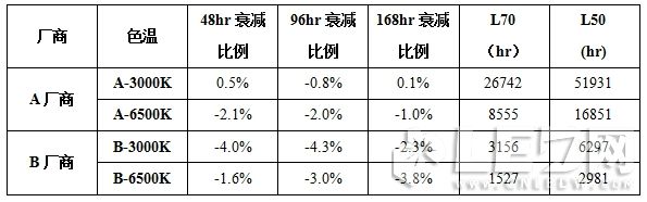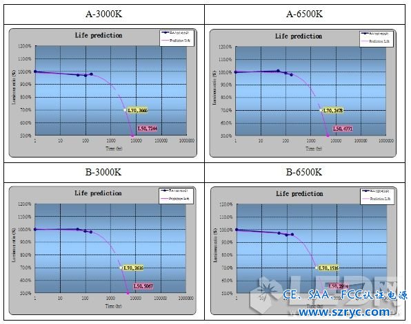 需要說明的一點(diǎn)是:本文中的快速老化試驗(yàn)所作出的壽命推估只做參考使用,目前還沒有一個(gè)快速老化試驗(yàn)的標(biāo)準(zhǔn),所以此方法僅作為照明應(yīng)用廠在同等試驗(yàn)條件下將多家供應(yīng)商的LED顆粒進(jìn)行比較試驗(yàn),擇優(yōu)選取的參考。