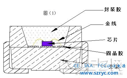如上圖(1)所示,LED主要的原物料有封裝膠、金線、晶片、固晶膠、支架五個(gè)部分。每種物料都會(huì)直接影響LED性能。例如較差的封裝膠不但會(huì)導(dǎo)致出光效率低,更會(huì)導(dǎo)致材料容易受潮,硫化風(fēng)險(xiǎn)增大。