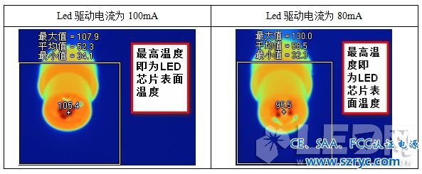 從上圖可以看出,LED驅(qū)動(dòng)電流下降20%,對應(yīng)的LED芯片表面溫度下降17%。另外130°已經(jīng)超過了LED芯片的最大承受溫度(一般中小功率芯片為115°,較好點(diǎn)的為125°)。過高的溫度不但導(dǎo)致LED芯片損傷,熒光粉激發(fā)效率降低,也會(huì)使支架上的反射蓋黃化,從而最終都會(huì)導(dǎo)致LED光衰嚴(yán)重。