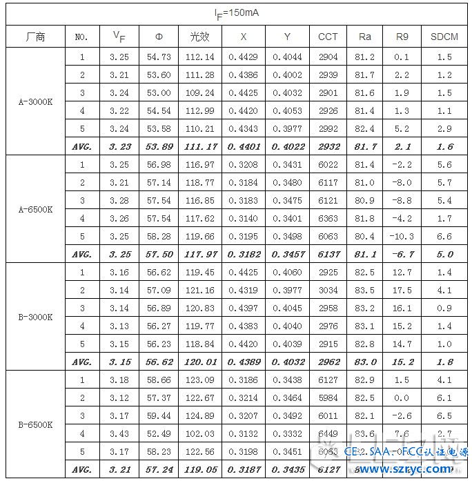 對A、B兩家LED顆粒樣品進(jìn)行初始參數(shù)測試,測試結(jié)果如表1,從表格中可以看出A、B兩家材料初始光通量相當(dāng),其中B廠商電壓較低,整體光效會(huì)高于A廠商。