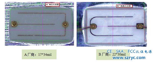 從晶片2D圖可以看出A廠商使用的晶片尺寸大于B廠商,A廠商芯片的最大承受能力會(huì)大于B廠商,即在過電流操作的情況下,A廠商的的光衰會(huì)小于B廠商(2.2.4的老化試驗(yàn)也證明了這點(diǎn))。
