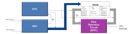 示例中可以看到,采樣輸入通道使用DTC移動(dòng)并使用DOC控制以檢查報(bào)警條件,無(wú)需任何CPU干預(yù)。之后,DTC自動(dòng)將ADC結(jié)果(掃描模式)傳輸?shù)絊RAM以進(jìn)行報(bào)警,存儲(chǔ)在SRAM中的可編程閾值電平將通過(guò)DOC自動(dòng)比較/添加/減少以檢查警報(bào)狀況。
