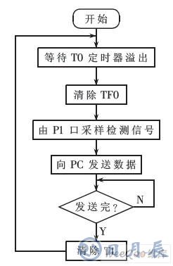 當(dāng)51單片機(jī)上電后,便開(kāi)始不停地采樣和發(fā)送數(shù)據(jù), 這類(lèi)似于計(jì)算機(jī)上的“DMA”方式,單片機(jī)的主程序流程圖如圖2所示。主程序部分代碼為: