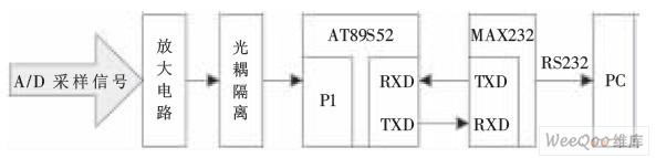 本設(shè)計(jì)采用廉價(jià)的51 單片機(jī)作為信號(hào)采集器,51單片機(jī)將采集的數(shù)據(jù)通過(guò)RS232串口發(fā)送給PC,PC再對(duì)這些數(shù)據(jù)進(jìn)行記錄和分析并且繪制波形。 硬件部分的結(jié)構(gòu)如圖1所示。