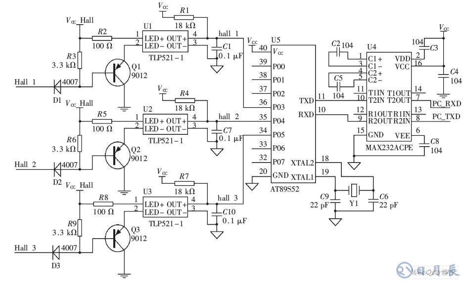 霍爾傳感器在無(wú)刷直流電機(jī)控制系統(tǒng)中起著非常重要的作用。它用于檢測(cè)轉(zhuǎn)子磁極的位置, 為開(kāi)關(guān)電路提供正確的換相信息。若霍爾傳感器的相位產(chǎn)生偏差則會(huì)使電子換向的時(shí)間發(fā)生偏差, 影響電機(jī)的轉(zhuǎn)速和平穩(wěn)度。若霍爾傳感器的相位缺相,則會(huì)使電機(jī)相電流變大和電磁轉(zhuǎn)矩脈動(dòng)增大, 甚至燒毀電機(jī)。所以霍爾相位的檢測(cè)是十分重要的#本文中將設(shè)計(jì)的邏輯信號(hào)檢測(cè)分析儀應(yīng)用在電機(jī)霍爾傳感器信號(hào)檢測(cè)上。其硬件電路如圖3所示。