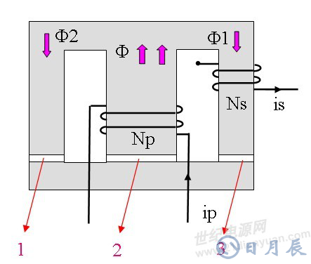 見下圖,假設(shè)氣隙1、2、3使得磁阻 R1=R2=R3,忽略窗口的那少部分磁通,可知 Φ=Φ1+Φ2。