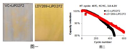 測試數(shù)據(jù)對比顯示,LDY269與傳統(tǒng)的負(fù)極成膜添加劑VC相比,具有阻抗小,低溫充電好,循環(huán)壽命好的優(yōu)點(diǎn)。當(dāng)LDY269和LiPO2F2一起組合時,效果更顯著,該組合能有效降低電池內(nèi)阻,改善電池高溫性能和循環(huán)壽命,如下圖一、圖二所示。