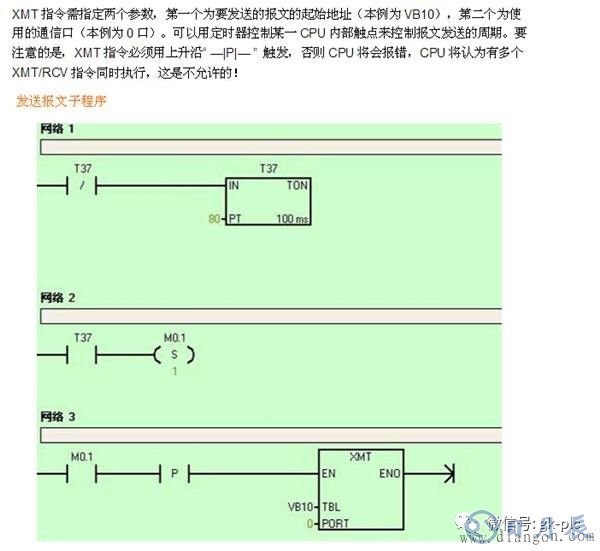 在《S7-200系統(tǒng)手冊》和Micro/WIN在線幫助中關(guān)于XMT和RCV指令的使用有一個例子。這個例子非常經(jīng)典,強烈建議學(xué)習(xí)自由口通信時先做通這個例子。例程,見下圖